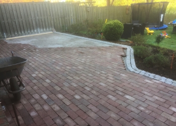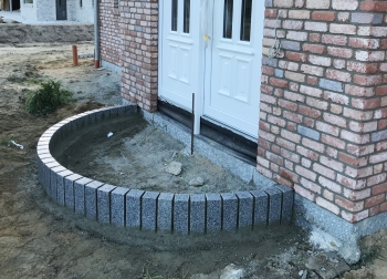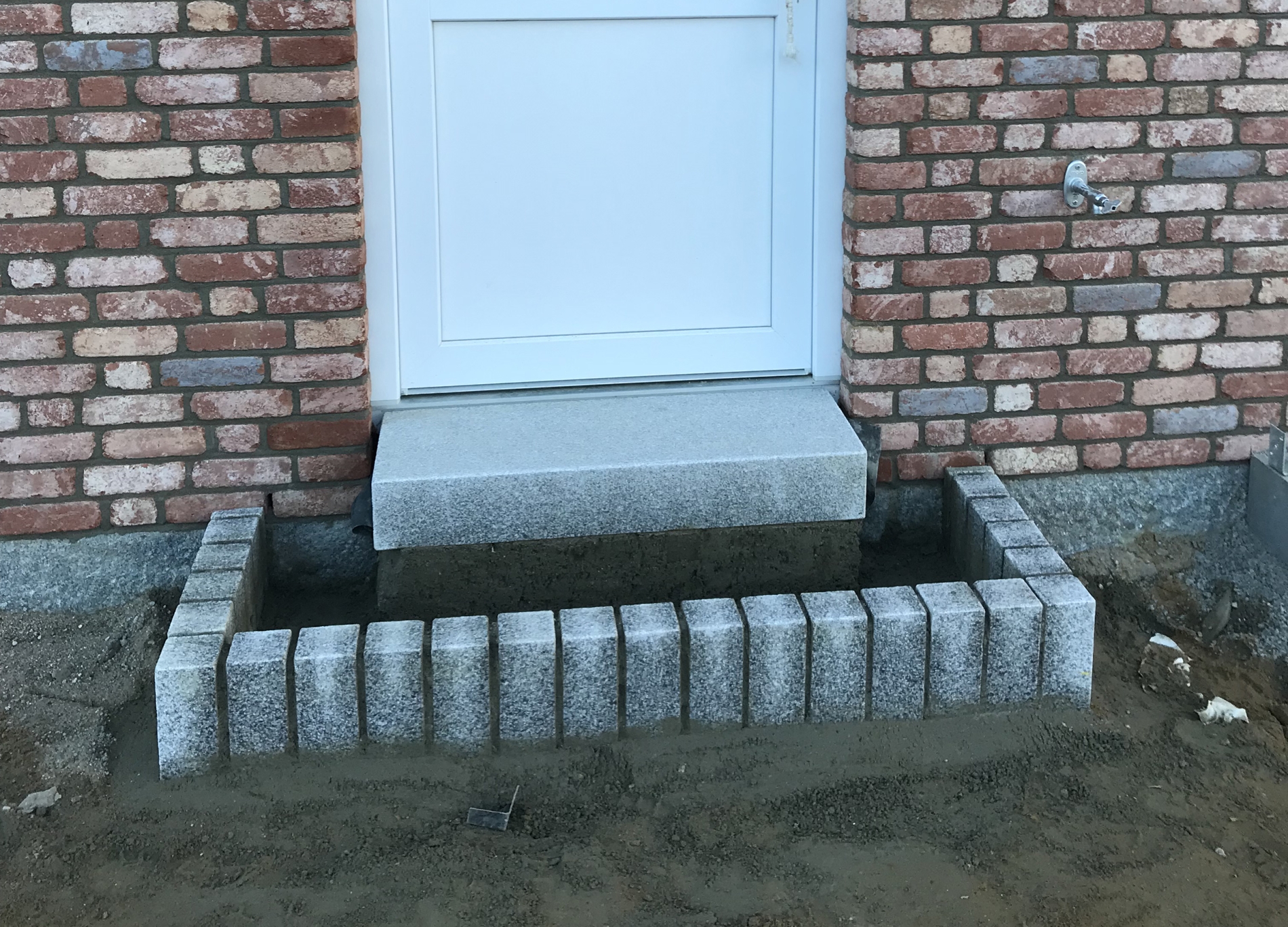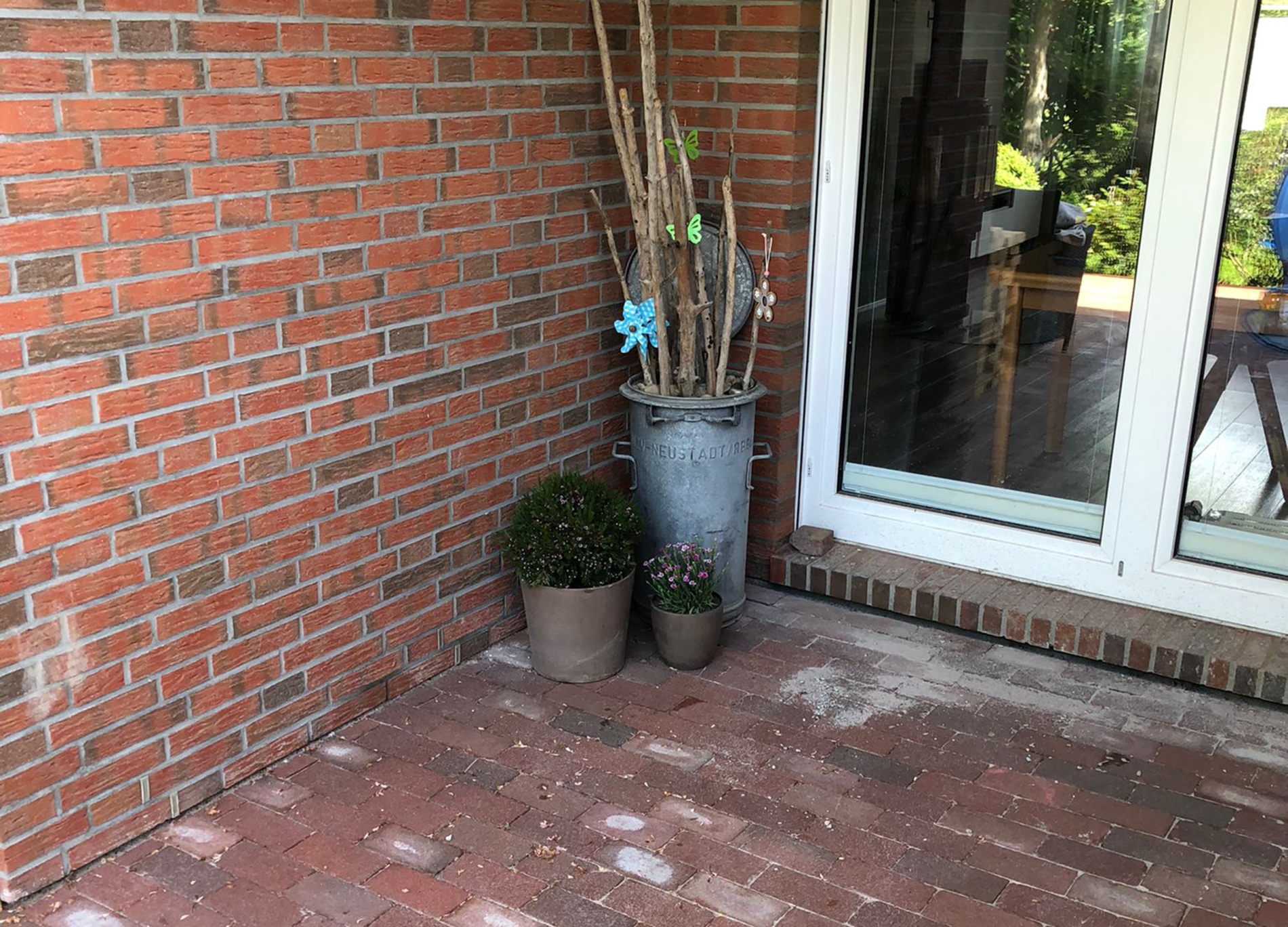 Bei dieser Terrasse wurden die alten grauen Steine von uns abgetragen, der Untergrund aufgeschüttet, Ziersteine als Fundament um die Terrasse vermauert, neu verdichtet und die neuen Pflastersteine verlegt. Türeinstiege und Kellersimse wurden mit gemauertem Steinwerk optisch verschönert.